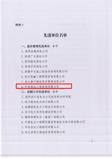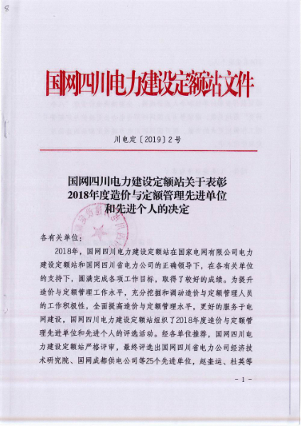 先進單位和(hé)個(gè)人(rén)——國網四川電(diàn)力建設定額站:2018年度四川電(diàn)力工程造價與定額管理(lǐ)先進單位和(hé)個(gè)人(rén)