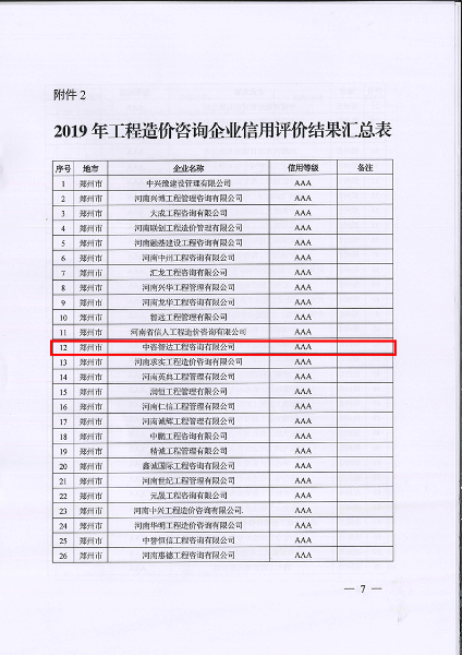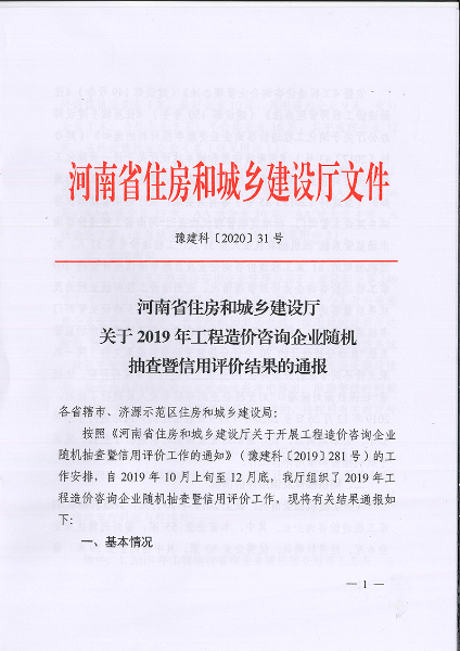 河(hé)南省住房(fáng)和(hé)城鄉建設廳2019年度工程造價AAA級企業
